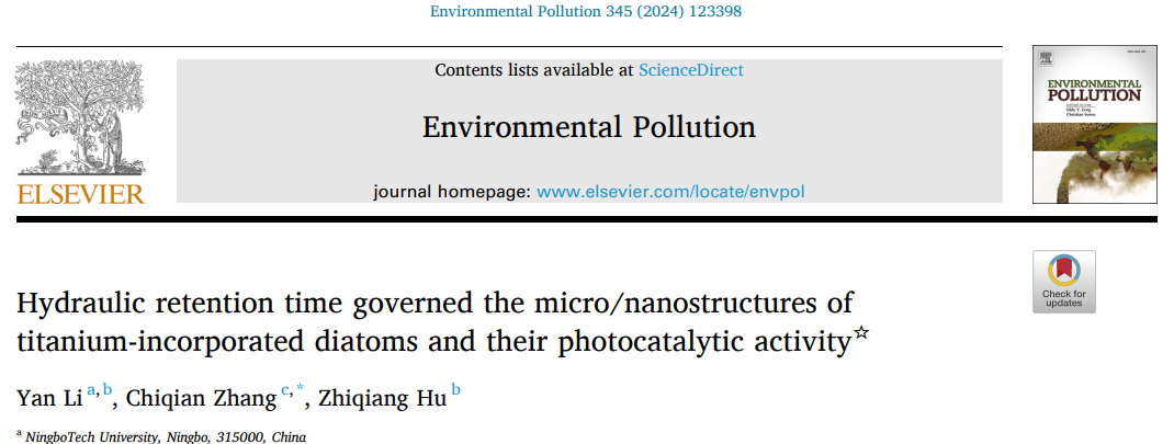 近期,土建学院教师李妍博士在载钛硅藻对有机污染物的选择性吸附和光催化降解率研究方面取得重要进展,相关成果《Hydraulic retention time governed the micro/nanostructures of titanium-incorporated diatoms and their photocatalytic activity》以第一作者身份在《Environmental Pollution》发表,Environmental Pollution为环境领域的世界顶级期刊,具有较高的学术影响力和学术声誉(ZJU100期刊,IF:8.9)。